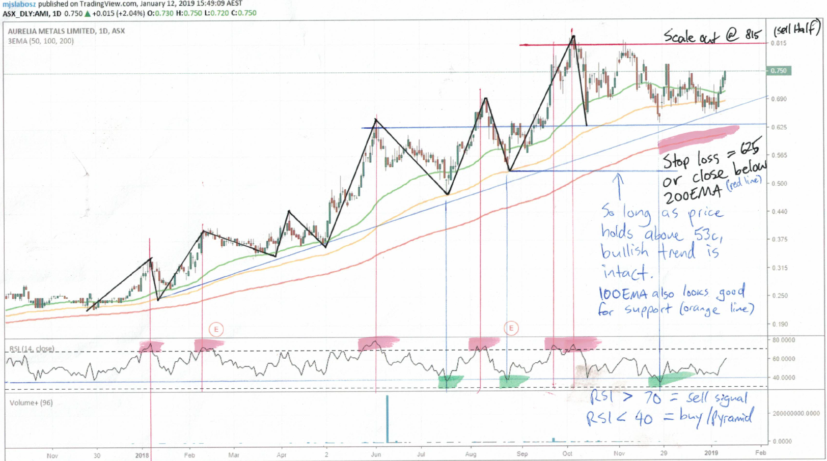 Then, once I decided where I wanted to enter, I determined that if price did indeed go higher, then it was likely to struggle at previous resistance – so I would be a seller at 82c – and that if it got all the way down to 62c, I wanted to be out, because then the trend (and my trade thesis) may have been violated.