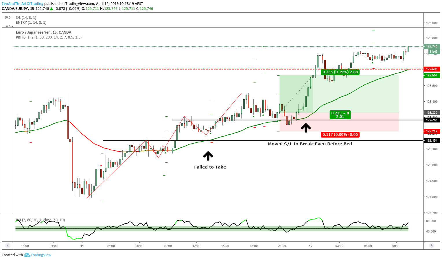 By 11:30pm I really wanted to go to bed, but I was still afraid that this trade would lose. So I rolled my stop-loss to break-even prematurely and shut down my charts.