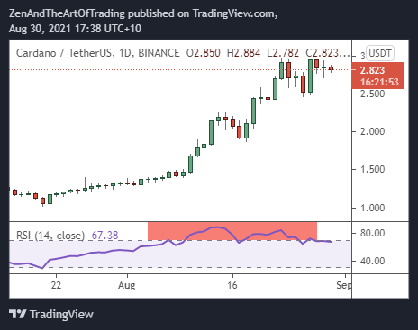 The RSI was originally designed to measure the momentum of a market. And so while it’s true that if it’s “overbought” or “oversold” that typically means a market is close to exhaustion, it also means that the market has very strong momentum.